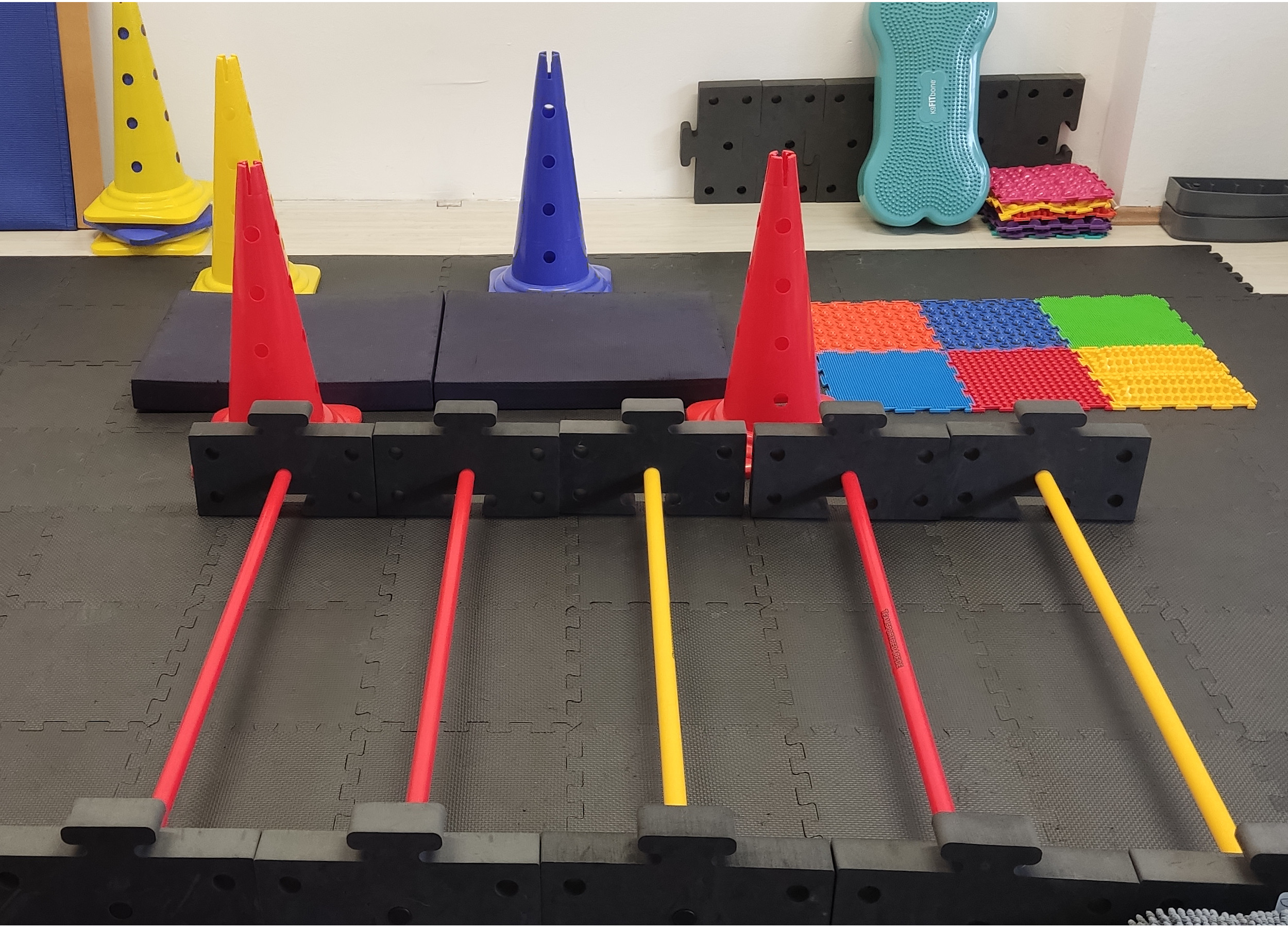 Zum Einsatz kommen Geräte wie Wackelbretter, Stabilisationskissen, Pylonen, Cavaletti-Stangen und Hocker und mehr.